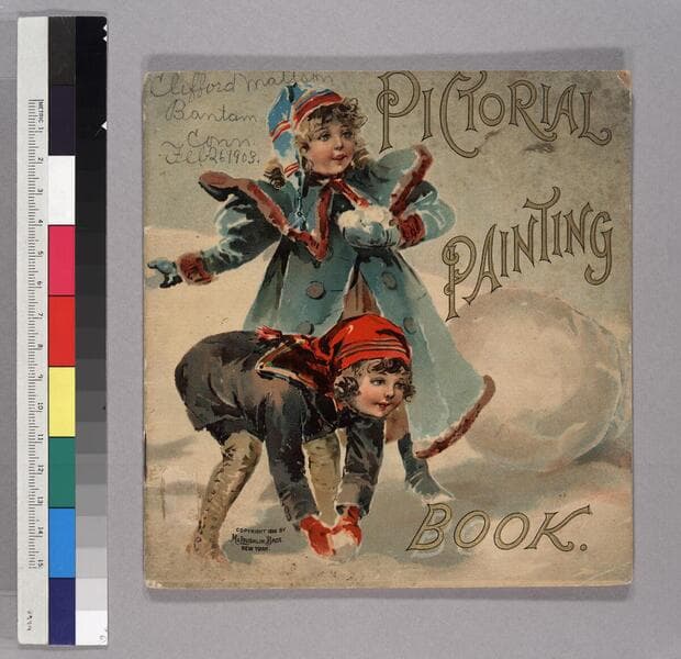 One drawing/painting book, ca. 1905, entitled Little Folks' Painting and Drawing Book, published by McLoughlin Bros., New York. This book is 32 unnumbered pages in length and is comprised of chromolithograph and black and white lithographs in outline form for coloring. The front cover features an image of two children wrapping a gift box. "0701, McLoughlin Bros. N.Y." is printed in the lower left-hand corner beneath the image. The back cover is not illustrated, but the paper is decorated in a simple pattern. "Directions" are printed on the front pastedown, and the title page is illustrated with a black and white image of a boy painting a fence. All of the illustrations are of animals; some have been colored. A ms. inscription in ink is on the title page. "2.-" (price) is written in ms., in pencil, in the upper right-hand corner of the title page.