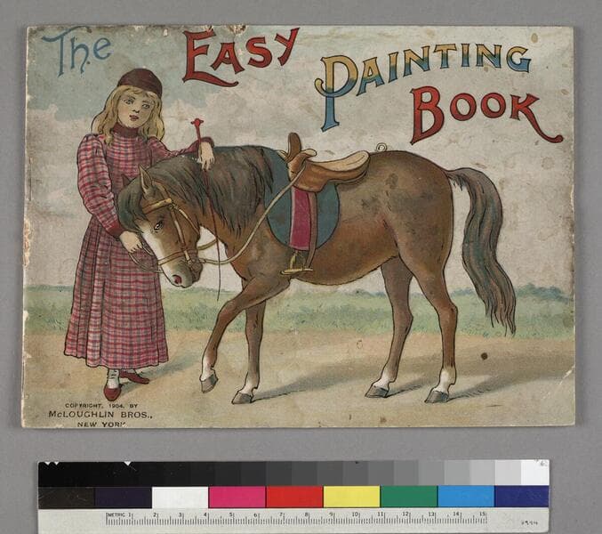 One painting book entitled The Easy Painting Book, published by McLoughlin Bros., New York, copyright 1904. The front cover shows a rooster standing on a path. The lower right-hand corner of the back cover bears the company's trademark and "No. 83." The inside front cover features six colored circles--yellow, red, blue, orange, green, and purple-- which are identified as Primary Colors and Secondary Colors. These colors were meant as a guide for coloring in the book's images and, as explained in the instructions printed on the inside of the back cover, they are the actual pigments to be used (with water) to apply color within the book itself. Six color images, including the cover and title page, are included. Four colored images are matched by four identical images printed only in outline, which have not been filled in. The images mainly depict children at play. Across the top of the inside cover, in pencil, has been written "These are the actual pigments--see inside back cover" and "6099/5".