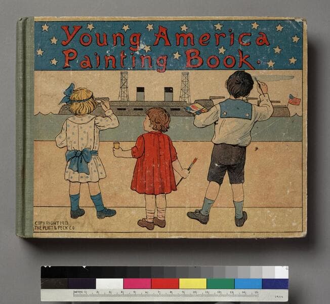 One painting book entitled Ideal Paint-Box-Book, with Easy Drawing Lessons for Young Painters, published by the Ideal Book Builders, Publishers, Chicago, Illinois, ca. 1907. This book-length painting book contains watercolors, a small palette and paintbrush, all of which folds into a box on the inside front cover. Unnumbered pages of both chromolithograph and lithograph images for coloring comprise the rest of the book. Text in the form of rhymes and poetry accompany most images. The front cover is a chromolithograph image of a boy and a girl painting with two such painting books. Within the body of illustrations, there are several containing racial slurs. The last page is a publisher's advertisement for these and similar painting books. Many of the lithograph images have been colored in with the paints provided. "Patented in United States, Nov. 12, 1907" and "Patented in Great Britain, Dec. 10, 1907" are printed at the bottom of the front cover.
