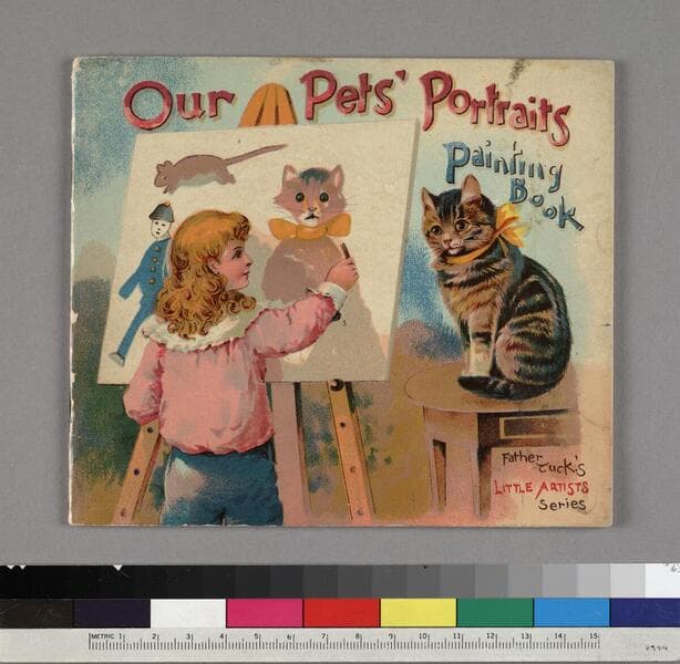 One painting book entitled Little People's Pictures Painting Book: Father Tuck's Little Artist Series, published by Kaufmann & Strauss Co., New York, ca. 1910. This 24-page painting book is comprised of lithograph images for painting and tracing and chromolithograph plates as samples. "Father Tuck's Little Artists Series" is printed in the lower left-hand corner of the front cover. The front and back covers are chromolithographs; the image on the front cover is of a boy, seated on the floor, in front of a painting he has created. The image on the back cover is of a child's drum toy. "Instructions for Little Artists" are printed on the inside of the front cover, and more information about color is printed on the inside of the back cover. "12.50" (price) is written in ms., in pencil, in the upper left-hand corner of the inside of the front cover.