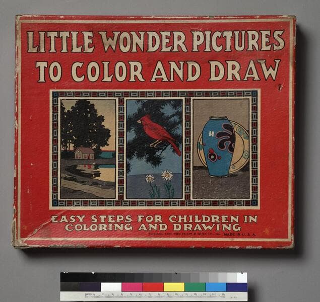 One boxed painting set entitled Cracker Jack Painting and Drawing Book for Crayon and Water Color Painting, manufactured by Saalfield Publishing Company, Akron, Ohio, New York and Chicago, copyright 1917. The set is comprised of six small cakes of watercolor paint in wooden tubs, two metal dishes, a paintbrush, a box of 8 (5 are missing) wax crayons, and a painting and drawing book that contains chromolithograph and lithograph images for painting and coloring. Printed at the top of the title on the top lid is "It's an Ullman Coloring Outfit." "The Ullman Mfg. Co., N.Y." is printed at the bottom of the top lid. The drawing/coloring book has been colored in, but not completely. The paints have been used. The painting book bears the copyright date of 1917.
