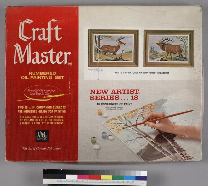 One boxed painting set entitled Craft Master, New Artist, Series 24, NA-2432 or Summer Quietude, manufactured by Palmer Pann Corp., Toledo, Ohio, copyright 1958. A paint by numbers set, the kit includes the original 24 jars of numbered paints, one jar of brush cleaner, one paint brush, and an 8-page newspaper-like color catalog of other paint-by-number kits for sale. The two companion "canvasses", entitled 'Summer Quietude', are lacking. The top lid of the cardboard box is illustrated with an image of a wooden palette, a red jar of paint, and a paintbrush that has painted the words "Craft Master." Also pictured, in the upper right-hand corner, are the two paintings included in this kit. Printed on the palette on the front cover is "genuine Kenro artist oil paints in easy to open screw-top jars." Also printed along the lower edge of the top lid is "[Copyright symbol] 1958 P.P. Corp." and "Litho in U.S.A."