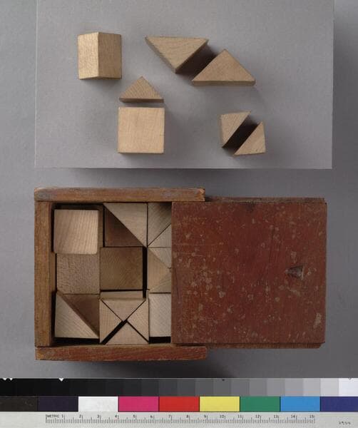 One set of wooden blocks entitled Bradley's Kindergarten Material, No. 3, Third Gift, manufactured by the Milton Bradley Company, Springfield, Massachusetts, ca. 1900. The set is comprised of 8 rectangular blocks, each measuring 2" x 1" x 1/2" (5 cm x 2.5cm x 1.3cm). The blocks are housed within a wooden box with a sliding lid; a paper label bearing the title and manufacturer's information is mounted to the front side.