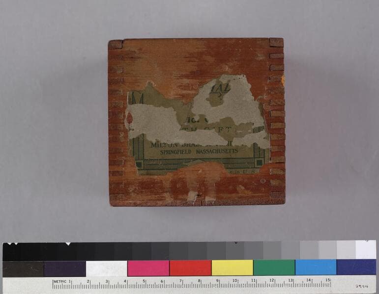 One set of wooden blocks entitled Bradley’s Kindergarten Material, No. 5, Fifth Gift, manufactured by the Milton Bradley Company, Springfield, Massachusetts, ca. 1900. The set is comprised of 11 square cubes, 6 large triangle forms (which, together, form three cubes divided diagonally), and 12 small triangular forms (which, together, form three cubes divided into quarters diagonally). One quarter triangle appears to be missing. Each of the whole cubes measures 1 inch (in height, width and depth). In addition, thirteen of the square blocks have numbers penciled on one side. The set is housed within a wooden box with a sliding lid and a paper label mounted to the front side. One use of these blocks was as drawing models.