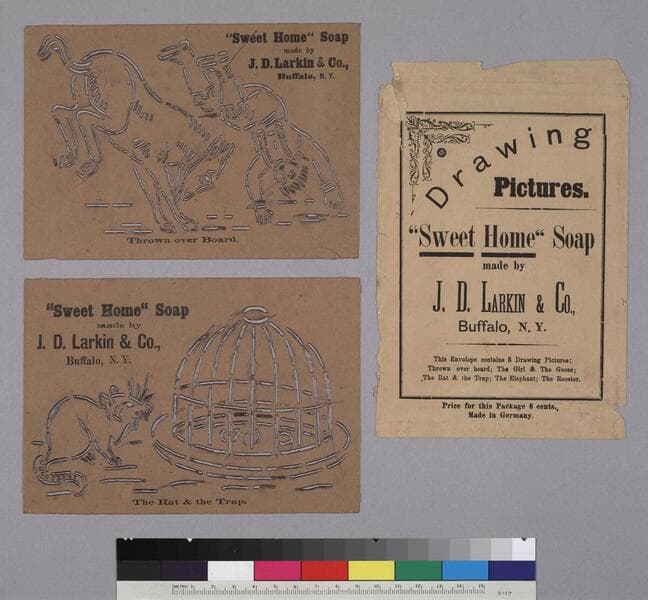 One boxed set of paper stencils entitled For the Kindergarten, For Little Folks, Drawing Made Easy, manufactured by [McLoughlin Bros.], ca. 1890. The set is comprised of 6 large paper stencils. The scenes of the stencils are named on the box lid: "Dutch Wind Mill, German Village, French Convent, New Navy, Old Navy, Summer Home." Accompanying the stencils are 4 illustrations made using the stencils. The stencils are housed within a paperboard box that bears a chromolithograph-illustrated label on the top lid. The label image depicts a boy who is drawing at a table. This image is surrounded by the title and a decorative border. The manufacturer's name is not present on the box nor on the stencils, but the set is very similar to sets 3 and 4 in Box 81, and was probably made by the same manufacturer. Also accompanying this set are four additional, smaller, paper stencils.