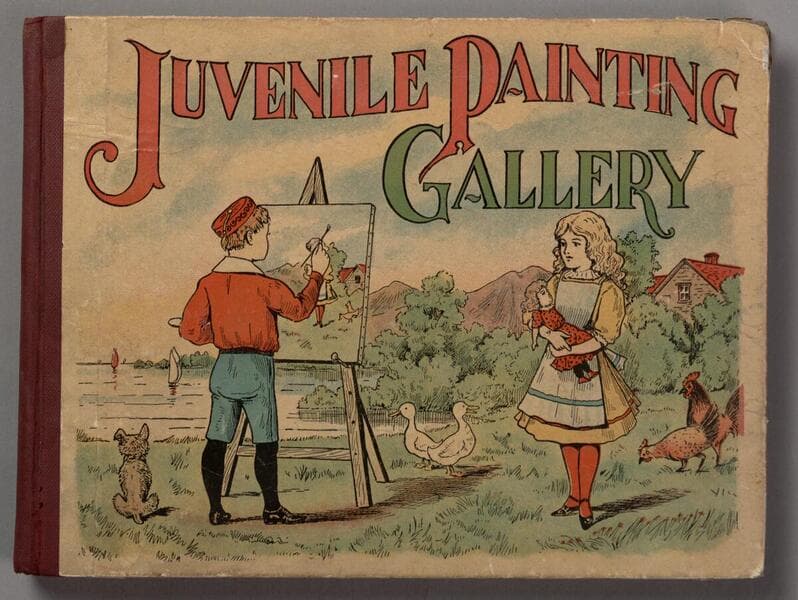 One manufacturer's advertisement and painting book entitled Dutch Boy Lessons in Painting, published by National Lead Company, New York and Boston, ca. 1910. This promotional booklet for Dutch Boy white lead paint is 14 unnumbered pages in length. The front cover is a chromolithograph of the "Dutch Boy", seated and admiring his small paintings. The back cover is also illustrated with an image of the Dutch Boy, and the lower two thirds of the cover contains a related advertising rhyme. A message about how to use this booklet entitled "To the Children" is printed on the inside of the front cover. A message "to the house owner" is printed on the inside of the back cover. The book is comprised of 8 pages of outline illustrations for painting, and 3 leaves of watercolor paints (6 colors to a page) for use in painting the illustrations. Below each image are a few lines of promotional text. None of the images have been colored in, and the paints have not been used.