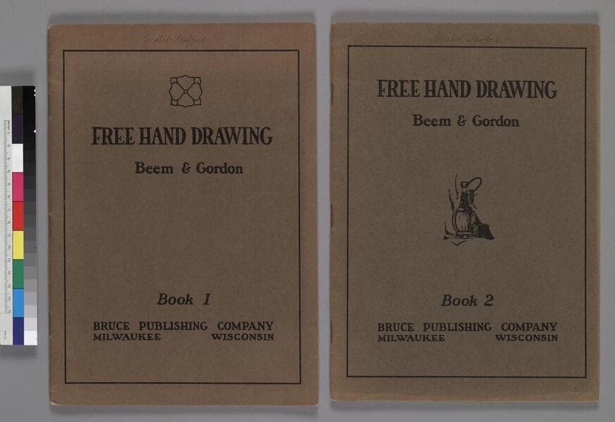 Three drawing books, entitled Bartholomew's Drawing Book, New Series, Nos. 1, 2 and 5, by William N. Bartholomew, published by Woolworth, Ainsworth & Co., New York, copyright 1867, 1869, and 1870 respectively. The exercises within each of the three books is comprised of 12 half-sheet numbered exercises interleaved with full-page blank leaves for copying and additional original artwork. Each book progress in level of difficulty, and the books themselves increase in their levels of complexity. Book 1 begins with exercises in drawing horizontal and vertical lines, and continues with using those lines in various combinations and patterns to draw simple designs and decorative forms. All of the exercises have been completed. On the inside front cover are notes and instructions for the series. Book 1 is missing the back cover; instructions for lessons 4 and later are missing. Book 2 incorporates angled straight lines, introduces curved lines, and begins to explore leaf and plant forms. These exercises are considerably more complex than those found in Book 1. Some of the exercises have been completed; primarily those at the very beginning and the very end of the book. The inside front cover contains notes about materials, notes to the teacher, and instructions for lesson 1. The back cover is also lacking. The 12 numbered exercises in Book 5 are of plants and flowers. Some of the images include pansies, lily of the valley, and a rose. Most of the exercises have been copied, and there are additional original drawings, some dated by the artist. The inside of the front cover contains notes about the materials to be used for this book and general remarks. The inside of the back cover contains instructions for using and copying the 12 lessons within the book. The outside back cover is a publisher's advertisement for various items within the "Bartholomew's System of Drawing", including writing and drawing slates, drawing books, drawing cards and a teacher's guide. The paper wrapper added by (presumably) Alice Dodge contains pencil sketches and doodles. "Henry I.[?] Tubbs" is written in ms. on the front covers of Books 1 and 2 in the upper right-hand corner. "Alice Dodge, Sept. 28, 1871" is written in ms., in pencil, across the top cover of Book 5.