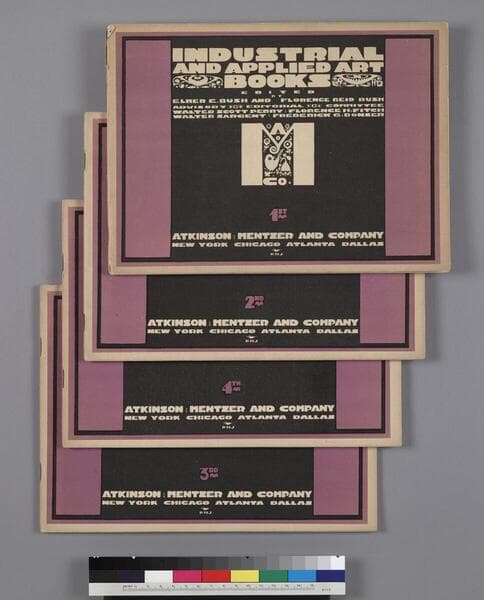 Twelve drawing books entitled Applied Arts Drawing Books, edited by Wilhelmina Seegmiller, published by Atkinson Mentzer & Grover, New York, Chicago, Boston, Atlanta, and Dallas, copyright 1908. Two "issues" per year; the 12 volumes are labeled (?) as follows: Fourth Year, Spring; Fourth Year, Autumn and Winter; Fifth Year, Autumn and Winter; Fifth Year, Autumn and Winter; Sixth Year, Autumn and Winter; Sixth Year, Autumn and Winter; Seventh Year, Autumn and Winter; Seventh Year, Autumn and Winter; Eighth Year, Autumn and Winter; Eighth Year, Autumn and Winter; Eighth Year, Autumn and Winter. (some duplicates) These instruction books contain black and white illustrations, color plates, and instructional text. At the bottom of each cover: "Copyright 1908 by Wilhelmina Seegmiller, Entered at Stationers Hall, London". Each volume is vertically oriented, with the spine at the top of the volume, so the user opens the cover and turns each page up, instead of to the left, as usual. Covers are printed in green, and have a decorative border with the company's logo in the center. Each volume averages 32 pages.