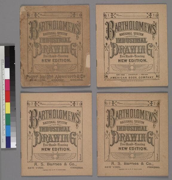 Seven drawing books entitled Bartholomew's National System of Industrial Drawing, Free Hand, New Edition, Nos. 6, 6, 10, 11, 12, 12, 13, by William N. Bartholomew, published by three different publishers, 1881-1882. Nos. 6 (env. 5), 11 (env. 8) and 12 (env. 10) were published by Potter, Ainsworth & Co. of Boston, New York and Chicago. Nos. 6 (env. 6), 10 (env. 7), 13 (env. 11) were published by American Book Company of New York, Cincinnati and Chicago. No. 12 (env. 9) was published by A.S. Barnes & Co. of New York and Chicago. All of the books are 16 pages in length and contain 14-30 numbered exercises. This series progresses from simple, two-dimensional copying and tracing (book no. 6) to significantly more complex, 3-dimensional copying and replication of the provided images (book no. 13). The books in this series are designed to build upon the previous skills and knowledge gained in the earlier books: "the pupil is gradually led to place more dependence upon his own judgement." The exercises in book no. 6 consist primarily of two-dimensional floral designs, patterns and vases and pitchers. Book no. 10 has a combination of two-dimensional patterns and designs, but also has several three-dimensional floral images of leaves and bunches of fruit. Books 12 and 13 are almost exclusively three-dimensional floral patterns, designs and scenes. Instructional text accompanies the exercises, but there is space next to each exercise for copying. All of the front covers are identical to each other; a simple but decorative line border surrounds the text, with an Egyptian aten between the title and edition statements and the publisher. The books published by Potter, Ainsworth & Co. have a publisher's advertisement on the back cover which is entitled Standard Text Books. The lone book in this group published by A.S. Barnes & Co. bears the same advertisement on its back cover. The remaining books have a publisher's advertisement from the American Book Company on their back covers. On the insides of the front and back covers of each of these books is an explanation of the philosophy of the Bartholomew system and the goals and objectives for each book in the series. Only the first copy of book no. 6 (env. 5) has been completed by a previous owner. In this book, the first exercise has been colored in with crayons, and the rest have been completed in pencil. "Robert C. Vose" is written in ms. at the head of this book. Book Nos. 6 (env. 6), 10, 11, 12 (second copy, env. 10) and 13 have ".50" (price) written in ms., in pencil, in the upper left-hand corner of the front cover. Book No. 12 (env. 9) has "3-" (price) written in ms., in pencil, in the upper right-hand of the front cover.