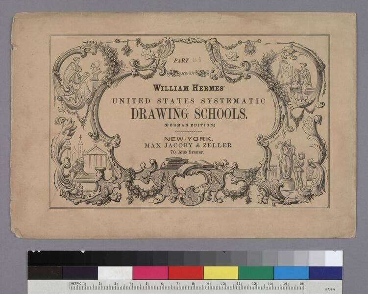 Two sets of drawing cards entitled Systematic Drawing Cards for Schools, with Instructions: In Two Parts, by Sigismond Schuster, published by Ivison & Phinney, 1857. Env. 07 contains the first part in a green-patterned wrapper labeled "Drawing Cards for Schools & Families" and subtitled "Part I. Nos. 1 to 24." The instructions and the cards for both Parts I and II were printed on yellow paper. Cards were divided into "books" of seven cards each, according to the instructions, for teaching principals of drawing. Part I featured 24 cards comprising the first three books plus half of book four--only card No. 24 is missing from Part I. It is unclear how many cards were in Part II--located in Env. 8, present are a total of 16 single-sided cards--the cards begin with "25" and end with "47." Within that number run, 25 to 47, cards 36, 37, 39, 41, 43, 45, and 46, are missing. One card has a partial number which appears to be "35". If the instructions are followed there should be a total of 42 cards--six books described, seven cards to a book. The higher number may reflect a change in methodology or added practice cards. In any case, the cards reflect different levels of skill, from simple forms to complex landscapes. The landscapes are scenes from Hoboken, New Jersey. Some of the images are signed "S. Schuster," usually in the lower left hand corner. "Natalie J. B[??]ment" is written in ms., in ink, on the cover. "$7 6.5" and "PCQ" are written in ms., in pencil, on the cover.