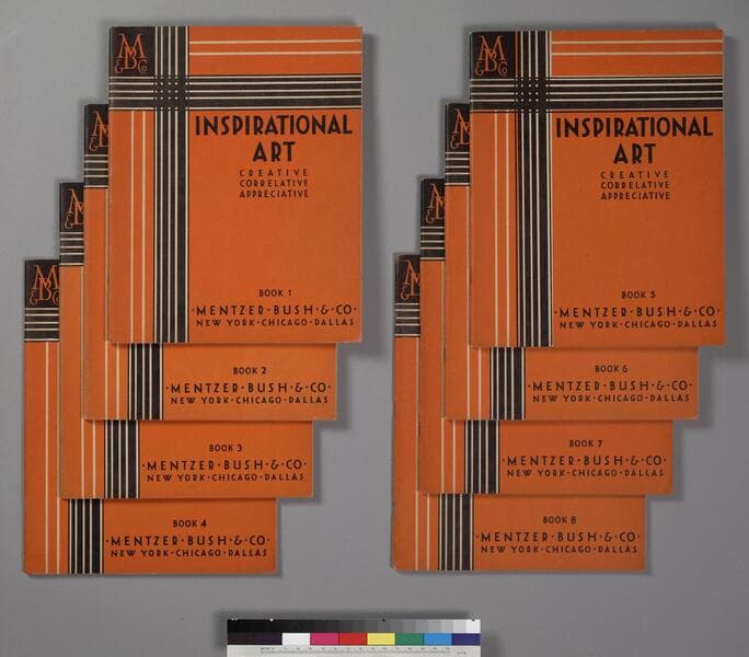 Seven books entitled Industrial and Applied Art Books, published by Mentzer Bush & Co., New York, Chicago, and Dallas, copyright 1926. Edited by Walter Scott Perry, Florence H. Fitch, Walter Sargent, and Frederick G. Bonser. Published in eight parts, book No. 2 is lacking from this set. Each of the seven books are 48 pages in length, and contain a wide variety of art projects for students. The projects range from simple coloring exercises (beginning with book 1) and progress to more sophisticated projects such as printing and book binding (in book 8). All of the books contain black and white and color illustrations. Each exercise or lesson is comprised of a sample or template, instructional text for the student, and additional instructional text for the teacher. The project template can be cut out of the book for use; a few have been cut out but laid in place. Some of the projects included within these books are: coloring, lettering, drawing, weaving, patterns, design, clay work, basketry, sewing, bookbinding and art appreciation. All of the covers are identical to each other (except the issue number); the covers are in black and orange, with the title framed by tall trees on either side. The insides of the front covers, as well as both sides of the back covers, are decorated in black and white decorative patterns. Each of the seven books have an embossed stamp "S" (Mabel Spofford) at the top of each front cover.