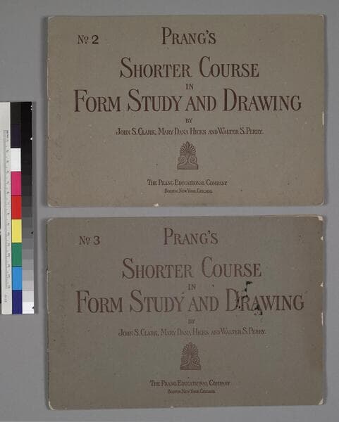 Twelve drawing books entitled Prang's Complete Course in Form Study and Drawing, by John S. Clark, Mary Dana Hicks, and Walter S. Perry, published by Prang Educational Company, Boston, New York and Chicago, 1889. Book No. 3 is lacking, and there are duplicate copies of Nos. 2, 4 and 5, although the previous owners (students) differ for each. All twelve books are 24 pages in length and contain drill exercises on the first 2 pages and numbered exercises on the remainder. The exercises in the earlier books emphasize correct use of lines, both curved and straight, through copying of sample (lithographed) images. The exercises in some of the later books are significantly more complex and focus more on perspective, representation and light and shade. Each exercise consists of 1 or more sample images, textual instruction, and space for copying. Several of the exercises call for the image to be cut from colored paper and pasted in, near the model image. Some of the exercises include: leaves, fruit, decorative designs, plants, geometric shapes and forms, architectural details, buildings and scenes. The exercises within each book progress in level of difficulty, and the series itself progresses in difficulty from very simple to very complex. The front covers are decorated with a small decorative element below the title; on the back cover is a brief list of the materials needed to complete this book. The insides of the front and back covers are blank. Most of the books have been at least partially, if not wholly, completed by previous owners. Some of the booklets also contain colored paper cutouts that have been mounted into the corresponding exercise. Some, but not all, of the booklets have previous owners' names written in ms. on the front covers: "Chester F. Robie" on Nos. 1,4, 5; "Ruth E. Lane" on Nos. 2, 4, 7, 8 and 9; "G. Vernon Talbot" on No. 5; and "Geo. H. Garcelon" on No. 10. "3-" (price) is written in ms., in pencil, in the upper right-hand corners of Nos. 2, 4, 6, 7, 8 and 9. "Highland School, M.A. Paul" and "17.50" (price) are written in ms. in the upper right-hand corner of No. 10.