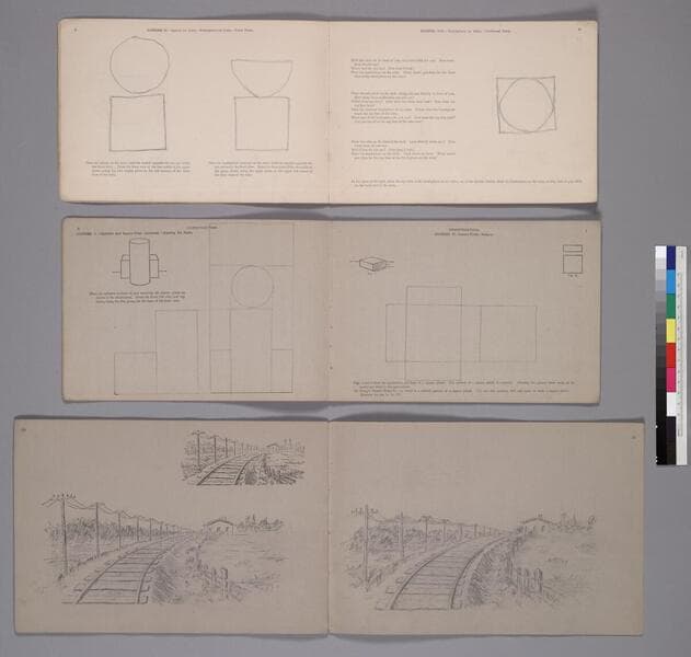 Two 20-page drawing books by John S. Clark, Mary Dana Hicks and Walter S. Perry, published by The Prang Educational Company, Boston, New York and Chicago. Each book contains numbered exercises that consisting of an image for copying, brief instructional text, and space for copying. Some of the exercises in both of these include: a pattern for a square prism, an envelope, decorative designs, a pattern for a square prism, a bowl of fruit and flowers. Both books have additional colored paper cutouts of some exercises either laid or mounted in; and both have been completed by previous owners.