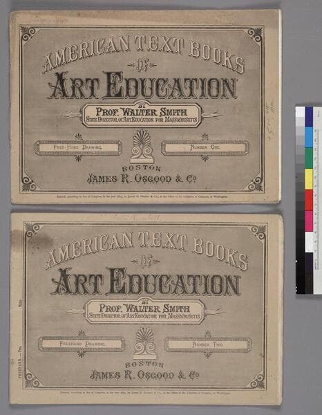 Two drawing books entitled American Text Books of Art Education: Model and Object Drawing, Number One and Number Two, by Walter Smith, published by L. Prang & Company, Boston, 1875. There are two copies of Number One; one is issued separately, the other bound together with Number Two. This "double issue" has an additional plain paper cover, with a Prang ownership stamp in the upper right-hand corner. On the inside of this additional cover is an ink stamp reading: "Royal B. Farnum, Director Art Education, State of Massachusetts", with "7/6/28" written in ms., in ink, below it. Each of the books is 20 pages in length, and contain numbered exercises. Each exercise is comprised of instructional text, a lithograph image for copying, and space for copying. The books have not been completed by previous owners. Some of the objects and models pictured in the books include: fruit and vegetables, drinking vessels of various kinds, seashells, chairs and geometrical solid forms. On the inside of each of the front covers are directions and instructions for using the books; on the inside of the back covers are illustrated names and definitions of the shapes and forms used throughout, and an advertisement for wooden drawing models. On the back covers are publisher's advertisements for other Smith books.