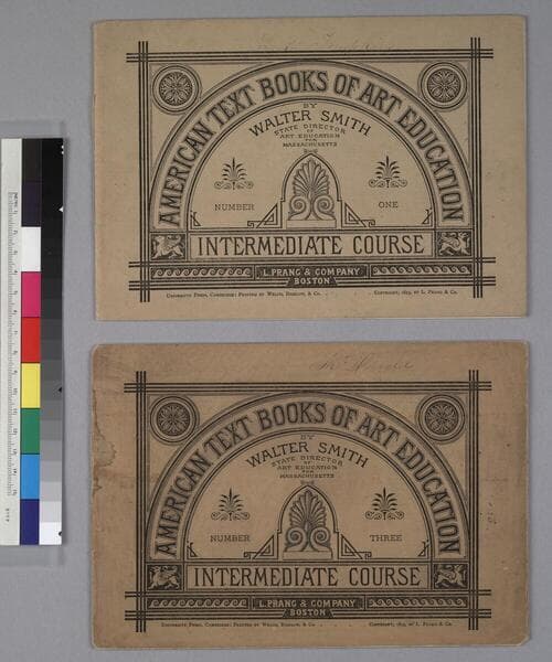 Two drawing books entitled American Text Books of Art Education: Model and Object Drawing, Number One and Number Two, by Walter Smith, published by L. Prang & Company, Boston, 1875. There are two copies of Number One; one is issued separately, the other bound together with Number Two. This "double issue" has an additional plain paper cover, with a Prang ownership stamp in the upper right-hand corner. On the inside of this additional cover is an ink stamp reading: "Royal B. Farnum, Director Art Education, State of Massachusetts", with "7/6/28" written in ms., in ink, below it. Each of the books is 20 pages in length, and contain numbered exercises. Each exercise is comprised of instructional text, a lithograph image for copying, and space for copying. The books have not been completed by previous owners. Some of the objects and models pictured in the books include: fruit and vegetables, drinking vessels of various kinds, seashells, chairs and geometrical solid forms. On the inside of each of the front covers are directions and instructions for using the books; on the inside of the back covers are illustrated names and definitions of the shapes and forms used throughout, and an advertisement for wooden drawing models. On the back covers are publisher's advertisements for other Smith books.