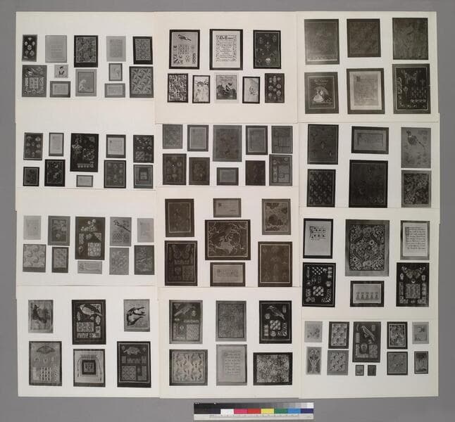 Three portfolios of samples from Germany which represent various forms of art with paper: paperweaving, sewing cards and paper-cutting and folding. The first set, in Env. 1, is entitled Flecht -u.-Ausuäh Schule; the second, in Env. 2, Versdur-u.-Buchzeichen Schule (Stringing and Bookmarking School); and the third, in Env. 3, Falt-u.-Ausscheide Schule (Folding and Cutouts School). The name "Louise Chur" is stamped at the bottom of the front cover of each of the three portfolios. The first portfolio contains 24 numbered (in ms.) samples of paper weaving, each labeled "Blott" and has "Louise Chur" written in ms., in ink, in the upper right-hand corner. Each sheet measures 5 3/4 in. W x 8 3/4 in. H ; 14.5 cm. W x 22.2 cm. H. The second portfolio contains a total of 23 samples of artwork; the first 11 of which are completed sewing cards; the next 2 are yarn tracings, and the last 10 are examples of paper weaving and folding. The sizes of the pieces vary. The third portfolio contains 20 examples of paper folding and paper cutouts, mounted onto cardstock. Much of the paper folding samples are reminiscent of origami. Each completed, mounted piece measures 8 in. W x 10 3/8 in. H ; 20.3 cm. W x 26.4 cm. H Title supplied by cataloger.