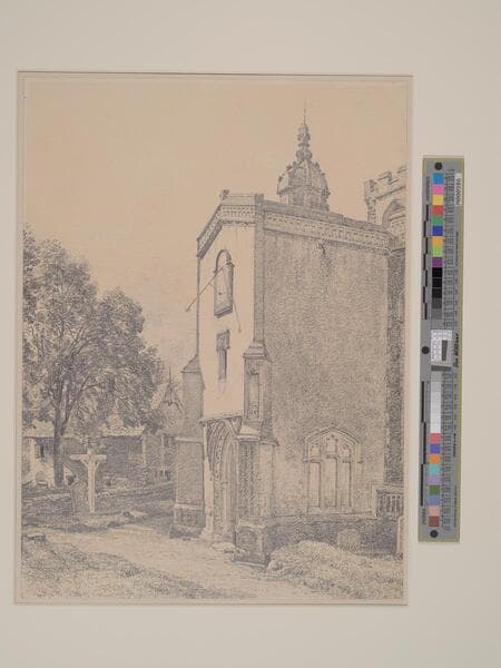 Though he lived and worked in London, Constable spent a number of summers visiting his family home in East Bergholt and sketching the landscape of the area. He gathered visual material that he would later work up into exhibition pictures back in his studio. This image, a meticulous description of the porch of St. Mary’s Church in East Bergholt village, is one of these sketches. In it, his controlled handling of the pencil allows him to capture as much detail as possible. In flickering touches of graphite, he has painstakingly recorded the rough texture of the building’s surface as it appears in afternoon shadow (2022).