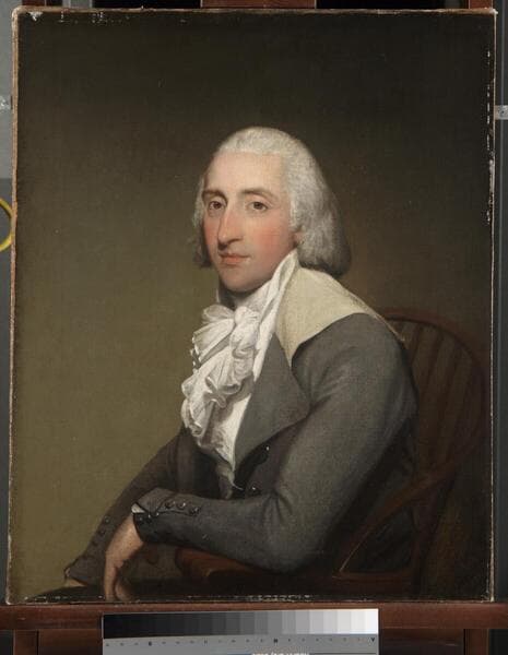In this portrait Gilbert Stuart depicts Lawrence Reid Yates in his professional role as a successful New York merchant. Yates leans forward in his chair and engages the viewer with an assessing gaze, while the simple Windsor chair and plain background suggest his modesty and thrift. In portraits of businessmen from this period, Stuart left his subjects' cuff buttons undone, as here, to indicate that they were too busy to care about dress.