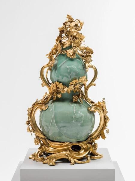 This beautiful and rare sea green celadon vase dates back to the Yuan dynasty of 14th-century China. Its double gourd shape is nearly obscured, however, by an energetic tangle of leaves, tendrils, and grapes that weaves its way up its sides and around its middle to end in a spiral on top. These gilt bronze mounts were added in the 18th century, by which time the vase had found its way to France. The mounts were probably paired with the vase in the shop of a high-end Parisian retailer, adding an extra touch of luxury to an already precious antique.