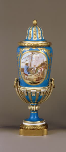 The name for this model, vase à pied de globe, refers to the lower section that is in the form of a globe stand. That term appears in the Sèvres documents once in 1769, the same year in which the first examples of vases made in this form are known (although the shape may have been introduced the previous year). The model was made in three sizes, this pair being of the smallest size, which also seems to be the most common. A simplified version of the shape was introduced in about 1774. A plaster model survives at the Sèvres manufactory with a similar silhouette but without the globe stand base and with Chinese heads at the sides. This plaster model is catalogued in an inventory of 1814 with the title vase chinois, however no surviving examples are known of this model with the Chinese heads. The title vase chinois also appears in the eighteenth-century documents; it is unclear, however, to which shape this term applies. The vase à pied de globe model may have been referred to by both terms in the eighteenth century and the shape was frequently described as a vase chinois from the nineteenth century.