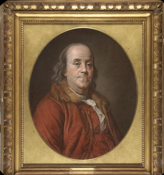 No artist captured Franklin's physical and psychological likeness as successfully as did Duplessis, and his iconic portrait (fig. 00) was hailed as a masterpiece when it appeared in the Salon of 1779.One critic commented: "His large forehead suggests strength of mind and his robust neck the firmness of his character. Evenness of temper is in his eyes and on his lips the smile of an unshakeable serenity." Copies appeared for sale almost immediately. Franklin encouraged this; the portrait was a personal favorite, and reproductions saved him the trouble of sitting to other artists. The present pastel is probably one of the replicas of the portrait made in the 1780s. Several contemporary oil copies, miniatures, and engravings exist, both by Duplessis and by other artists. However, pastel versions of this composition are scarce; there is only one other known, in collection of the New York Public Library. It was not unusual for artists to copy oil paintings in pastels. The technique, imported from Italy, flourished in eighteenth-century France, its vibrancy and smoothness appealing to artists and patrons alike. Pastel drawings were less expensive than oil paintings and could be produced faster, attributes particularly appropriate in the case of a busy and impatient man such as Franklin. Sellers has suggested that the New York pastel (once owned by Franklin himself) was Duplessis' preparatory sketch for his oil portrait Although the pose is identical, the costume is strikingly different: Franklin wears a conventional gray suit. The Huntington version matches the oil portrait.