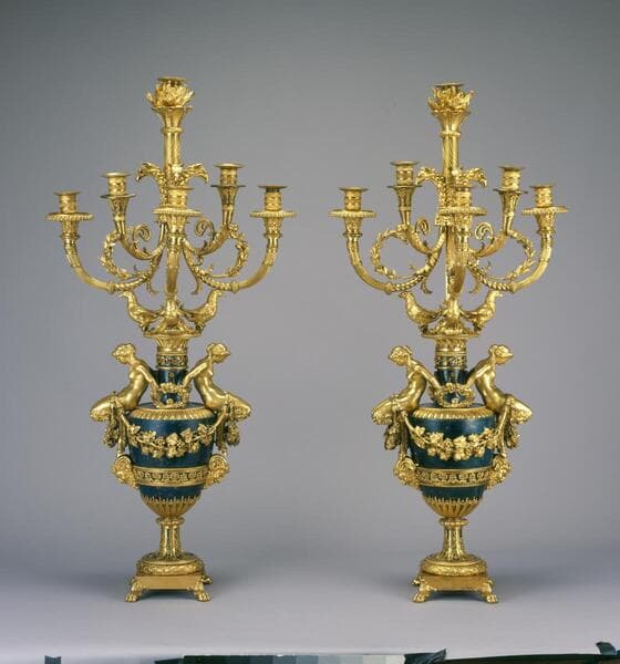 Both functional and highly decorative, these candelabra are two of the most impressive gilt bronzes in the Huntington collection, with their elaborate design, intricate construction, refined modeling, and brilliant finish. The design includes figures of female fauns, heavy vine garlands, fruiting ivy wreaths, and satyr masks, all alluding to lighthearted bacchanalian pleasures. The delicate branches, which once would have held candles, sit atop vases blued to imitate the precious stone lapis lazuli.