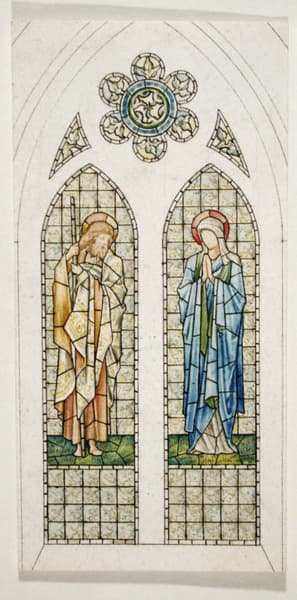 Two lancet windows with six-foil and tracery above (showing scrolled foliage); in lancets, 2 figures on quarried grounds, appear to be Joseph holding staff at left and Mary in blue at right