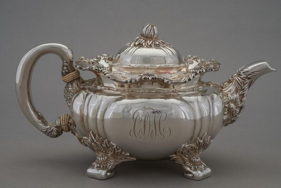 Tiffany introduced its Chrysanthemum pattern at the Paris Exposition in 1878. Patented in 1880, it quickly became one of the company's most popular designs. Chrysanthemum coffee and tea services feature lush blossoms and clusters of leaves, typical not only of the Rococo Revival style but also of the newly fashionable style of Japonisme that was becoming a major part of Tiffany's silver designs. Chrysanthemums have great significance in Japan, and their application on American silver reflects changing Victorian tastes and appreciation for the newly opened trade with Japan. This service belonged to Caroline Huntington Holladay, Henry E. Huntington's youngest sister, and the engraved initials are hers. It may have been given to her on the occasion of her marriage to Edmund Burke Holladay in 1896 by her uncle Collis P. Huntington and his wife Arabella.