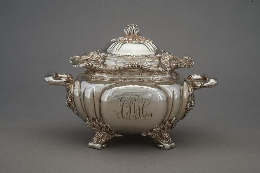 Tiffany introduced its Chrysanthemum pattern at the Paris Exposition in 1878. Patented in 1880, it quickly became one of the company's most popular designs. Chrysanthemum coffee and tea services feature lush blossoms and clusters of leaves, typical not only of the Rococo Revival style but also of the newly fashionable style of Japonisme that was becoming a major part of Tiffany's silver designs. Chrysanthemums have great significance in Japan, and their application on American silver reflects changing Victorian tastes and appreciation for the newly opened trade with Japan. This service belonged to Caroline Huntington Holladay, Henry E. Huntington's youngest sister, and the engraved initials are hers. It may have been given to her on the occasion of her marriage to Edmund Burke Holladay in 1896 by her uncle Collis P. Huntington and his wife Arabella.