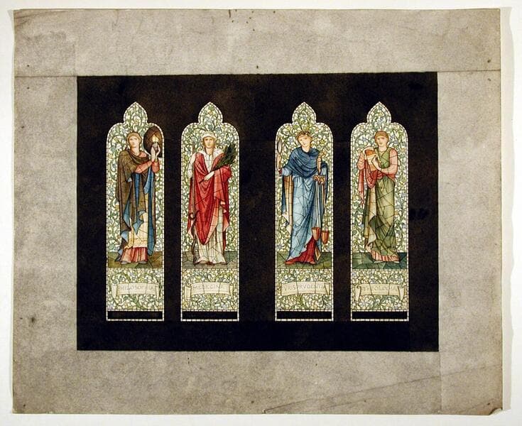 Foutr lancets - vine backgrounds with banners beneath- left figure, Philosophy, holding falme in both hands to right, green and red robes; Medicine holding robe with serpentine twined around and branch - red robes; jurisprudnce in blue holding mirror in right hand and scales in left; Theology in green and pink holding book to left.