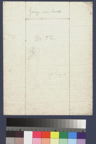 Three lights and tracery panels (six panels alternating green and blue, central vine motif). Left light shows Hope in white with blue ribbons, holding palm, reaching towards sky. Central light shows Charity in white over red, holding child - flame coming from her palm, two children at her feet. Blue background with red pattern above. Right light shows Faith holding lamp, Hydra t her feet - in white over lue. Faith and Hope have red drapery ground, blue pattern above. Scrolls below figures, Gothic canopies above. Verso shows drawing of canopy for light.