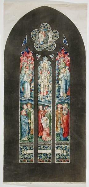 Three lights with tracery. Christ is depicted in the central panel. Christ and angels appear above apostles on the ground. Christ raising Lazarus in tracery above. Scroll on foliage ground beneath.