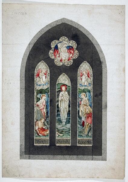 Left light shows angel with scroll above - angel below with soldier on ground. Central light shows Christ rising from the tomb. Right light shows angel with scroll above, and below, angel with soldier leaning against rock. Landscapa background - quarries above. Tracery is Salvator Mundi amongst seraphs (7 lobes around circle).
