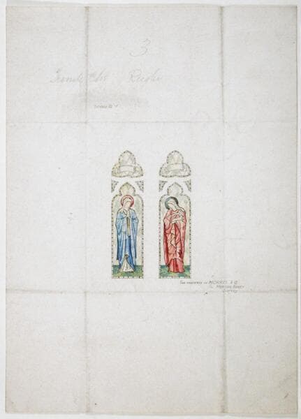 Stained glass window design with two lancets with cusps and tracery for name scrolls. Left light shows the Virgin Mary in blue with hands clasped. THe right light shows the figure of Humility in red holding a sheep.