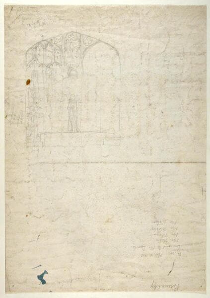 Christ in circle at top, in tracery, with a minstrel Angel on either side, and another at the head of each group of lateral tracery lancets, supported by seraph heads. The main lancets (5) are occupied by Apostles, going upwards. Sketch on reverse.