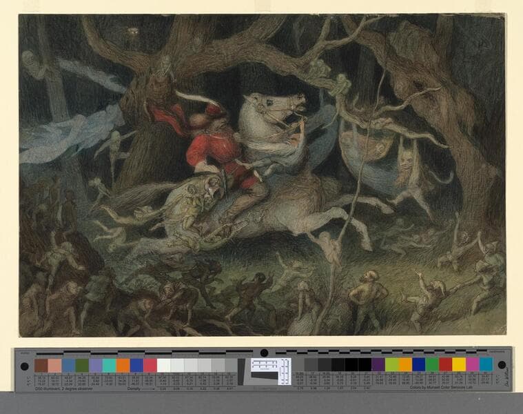 Doyle was a successful comic artist and book illustrator who was interested in fairy subjects. In this watercolor, he illustrates the Danish legend of the altar cup of Aagerup, as described in Thomas Keightley’s book The Fairy Mythology (1828). Doyle’s drawing captures the moment when a group of trolls, who have offered a golden cup to a farmer’s servant from Aagerup, try to stop the man from fleeing. Doyle produced many versions of this subject during his career. Here, he sets the struggle in a dark forest with twisted trees, which enhances the nightmarish quality of the action (2022).