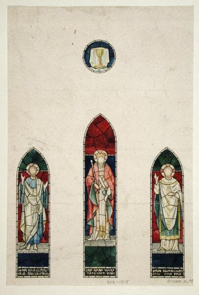 Design for stained glass. Three lancets and tracery circle showing Chalice left lancet shows Christ as prophet in white over blue, hands raised (green ground above, red behind, blue below). Central lancet shows Christ as king holding rod, with crown (red ground above, blue behind, green below). Right lancet shows Christ as priest, in priest's vestements (same ground as left).