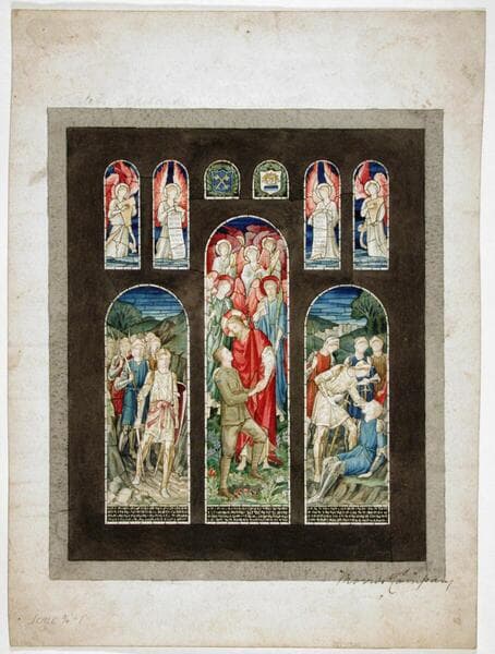Design for stained glass. Three larger lights depicting scene of War; six round-headed tracery lights, the central two shorter. The left of the three larger lights shows soldiers in armor, swords drawn, carrying banners. The tall central light shows Christ welcoming soldier into Paradise (soldier in modern uniform). Above angels with instruments, lilies and palm. Right light shows soldier giving drink to dying comrade. Four larger tracery show angels with dulcimers or scrolls. Two small tracery show shields.