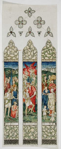 Design for stained glass. Three lights and tracery (three quatrefoils and trefoils and two small trefoils). Left light shows soldiers gathered, hands inprayer, one kneeling - ladscaped background. Central lancet shows Christ welcoming soldier to paradise - four angels above holdign lilies, palm, harp. Right light shows Peace - figures (mena and women) with wheatsheaf, orange branches, a square, an open book - shildren picking flowers - city in background. All three have grisaille work at toop and bottom and scroll beneath image.