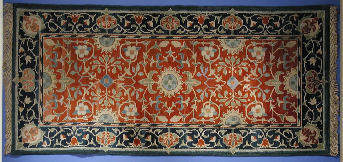 In 1879, Morris relocated his looms from Queen Square to the converted coach house in his own backyard in Hammersmith. The carpets made for the short period between 1879 and 1881 bear the distinctive "M" mark with a picture of a hammer and waves (symbolizing the Thames). For these hand-made carpets, which the firm called "Hammersmith" carpets, Morris developed two-way designs that could be read from any direction, as seen here. This example also shows Morris "quartering" his design, or dividing it into four blocks, each of which mirrors its neighbors. The star-like medallions that appear at the center and sides of the design were based on Persian carpets, which exerted a strong influence on Morris's designs and technique. The carpet thickness, measured at twenty-five knots per square inch, made them very durable and worth their higher price tag.