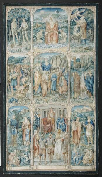 By the early decades of the twentieth century, the firm was making a concerted attempt to alter its style to meet the changing demands of fashion. The onset of the First World War further added to the difficulties faced by the firm's tapestry works, which was forced to close in 1916. Four years after the war, they reopened and were able to obtain a few important tapestry commissions, including one from George G. Booth (1864-1949) of Michigan for a church he was building in Cranbrook. Booth requested two tapestries illustrating stories from the Old and New Testaments, which were to be called "Old and New Dispensations." The tapestries, which were woven on the largest carpet loom at Merton Abbey, were each twenty-two feet high.