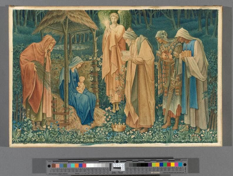 This watercolor is the design for a tapestry, originally produced for the chapel of Exeter College in Oxford in 1888. The drawing portrays the Holy Family, an angel holding the Star of Bethlehem, and the Three Kings bearing gifts for the Christ Child. The figures fill the composition like a sculptural frieze in a clear arrangement that the weavers of the tapestry could follow. This small watercolor, showing the full design, would have been used by Morris & Co. to attract patrons. The Adoration tapestry was produced eight times, and this design was later used in stained glass as well (2022).