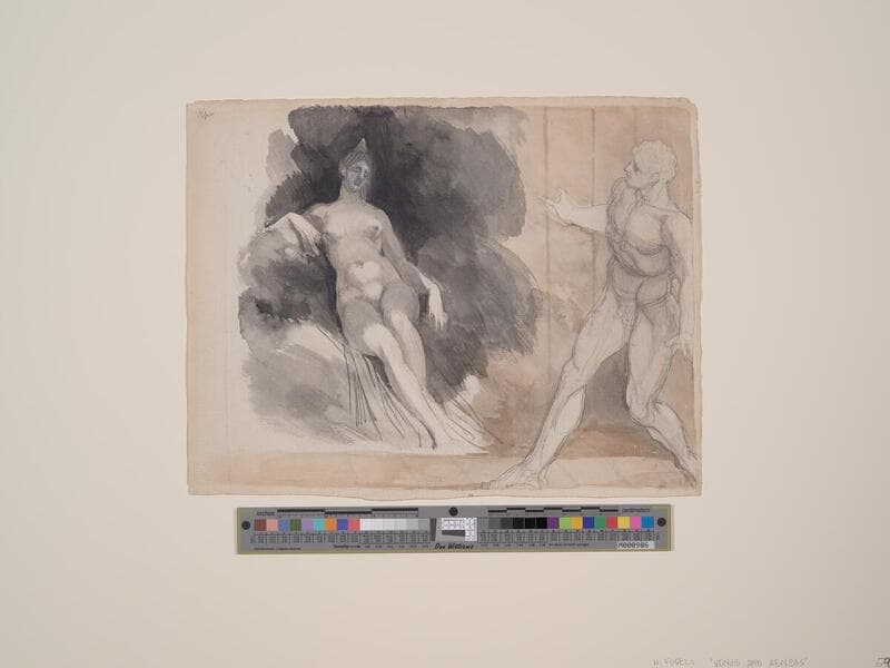 Fuseli enjoyed flaunting his classical learning. Here, he illustrates the obscure Greek myth of Ixion and Nephele. Out of pity, Zeus invited the accursed Ixion, king of the Lapiths, to dine with the gods on Olympus. While there, Ixion lusted after Zeus’s wife, Hera. Learning of this insult, Zeus tricked Ixion into coupling with a cloud in the shape of Hera (called Nephele, from the Greek word for cloud). The offspring of this union was Centaurus, who produced the race of centaurs.