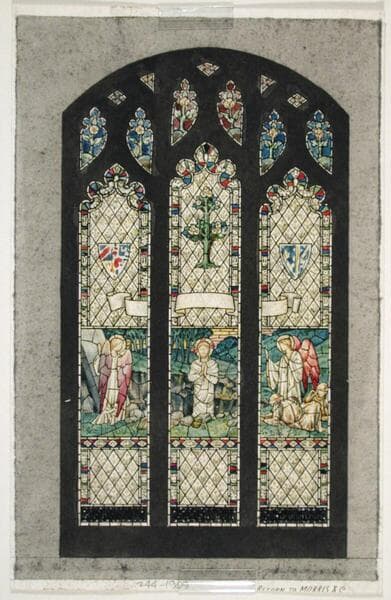 Three lights and tracery. Left light shows kneeling angel rolling away stone from the tomb. Central light shows Christ emerging from the tomb in white, with hands in prayer. Right light shows kneeling angel in profile to left, and sleeping soldier. Tracery of flowers.