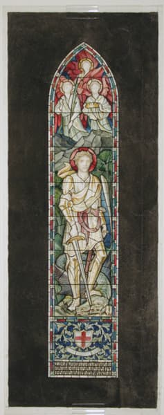 Single light, showing three angels holding crown and palm frond above standing figure in armor with sword and shield; beneath him lies a dragon, and beneath that a crest with a red cross on a white ground.