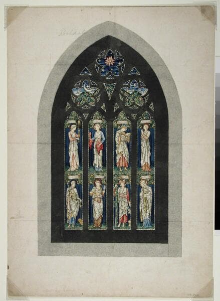 Three lights and tracery (two trefoils). All the figures robed in white with gold patterning; drapery backgrounds patterned with pale gold; foregrounds of reddish tiles. Details of Faith are picked out in green, of Charity in very pale pink and gold, of Hope in green and blue. Above the drapery backgrounds, instead of the more usual quarries or foliage, a wall with daisies and other flowers growing between the stones. (Description from Sewter, p. 90)