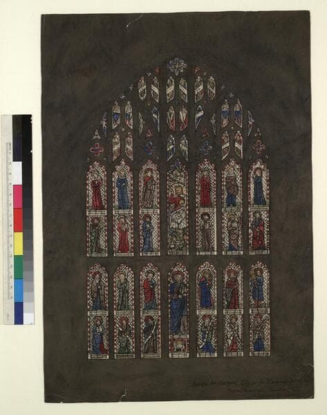 This design was for one of the earliest large-scale commissions to be received by the firm. The window consists of fourteen main panels and nearly three-dozen tracery panels. To emphasize the importance of the central panel, the firm has enlarged the figures of St. Peter in the lower tier and Christ in Majesty in the upper tier in contrast to the other saints. Philip Webb was largely responsible for the layout of these early commissions as well as for the geometric background pattern inspired by medieval precedent. The coloring of the windows was left to Morris, who aimed to achieve a jewel-like quality in the colored glass.