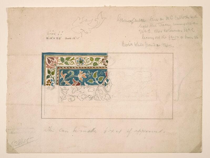 This carpet design was made for George McCulloch (1852-1920), one of Morris & Company's most significant Australian clients. McCulloch ordered a set of the firm's Holy Grail tapestries in 1898 along with a special Hammersmith carpet for the same room. Inscriptions in the upper right corner of Dearle's design describe the client's preference for brighter colors than in earlier Morris examples, which generally had a deep indigo blue center with a contrasting red border.
