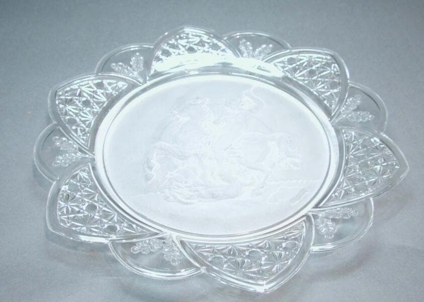 Gillinder's popular "Pioneer" pattern was introduced about the time of the United States' Centennial celebration in 1876. With its frontier theme, complete with log cabin, buffalo, deer, and kneeling Native American, this pattern—known today as "Westward Ho"—reflects a national nostalgia for the fast-disappearing Western wilderness.
