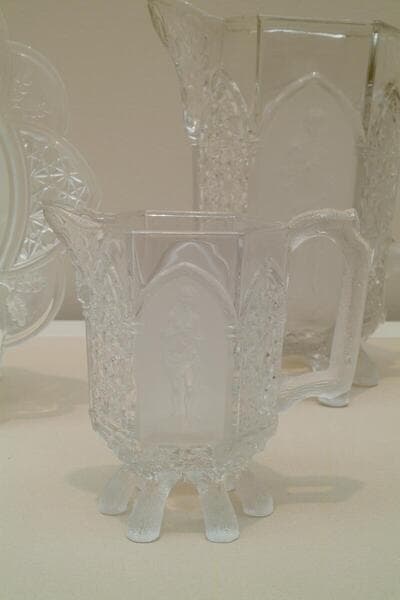 The decorative motifs in Gillinder and Sons' "Classic" pattern allude to forms seen in neoclassical sculpture, for example in Chauncey Bradley Ives's Pandora in the collection. The vessels' pointed gothic arches and rustic log feet, however, also reflect the rich stylistic eclecticism that characterized much mid-19th century American art.